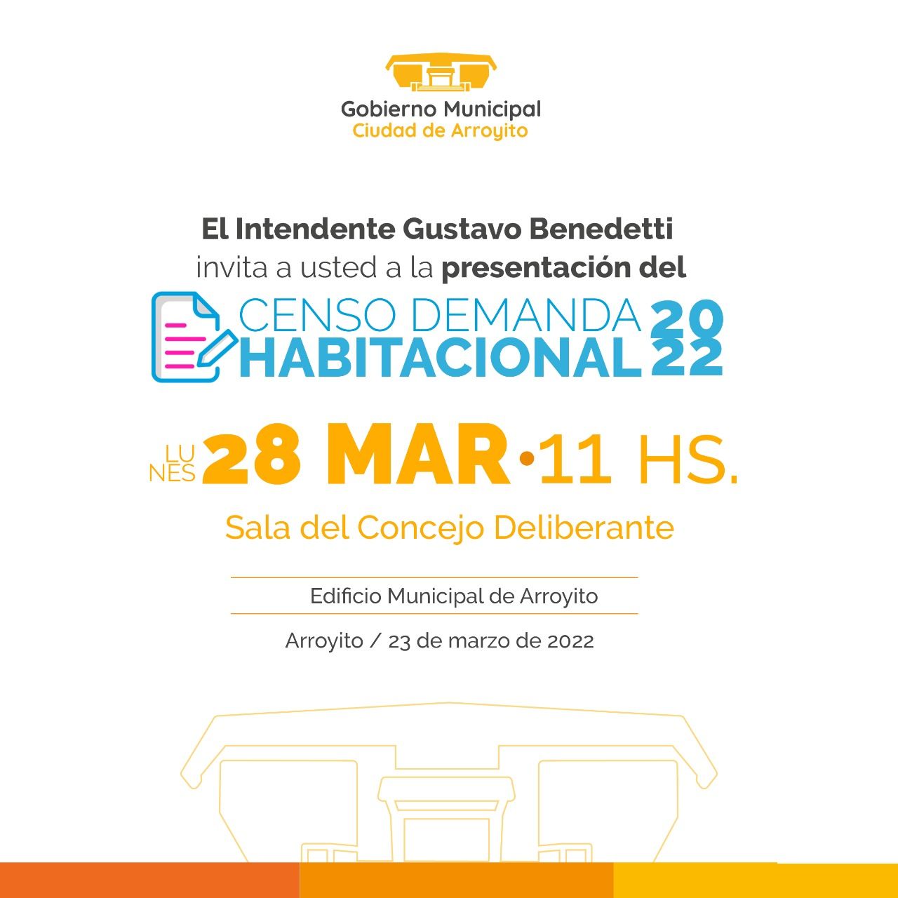 El intendente Gustavo Benedetti invita a usted a participar de la presentación del Censo de Demanda Habitacional 2022 diagramado por la Dirección de Viviendas del Gobierno Municipal.