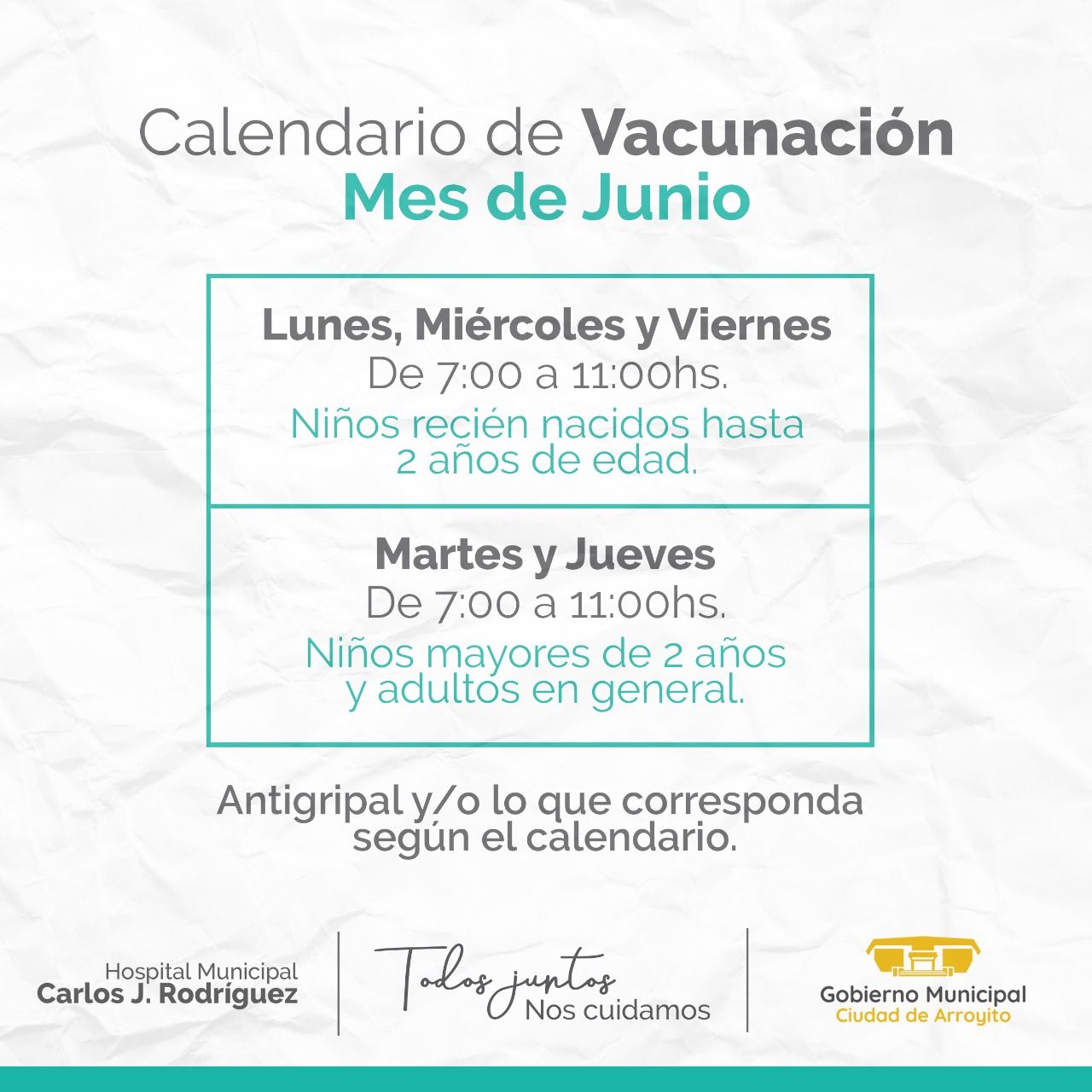 El Gobierno Municipal, a través del Hospital Municipal Carlos J. Rodríguez, comunica a continuación los días y horarios de vacunación del mes de junio.