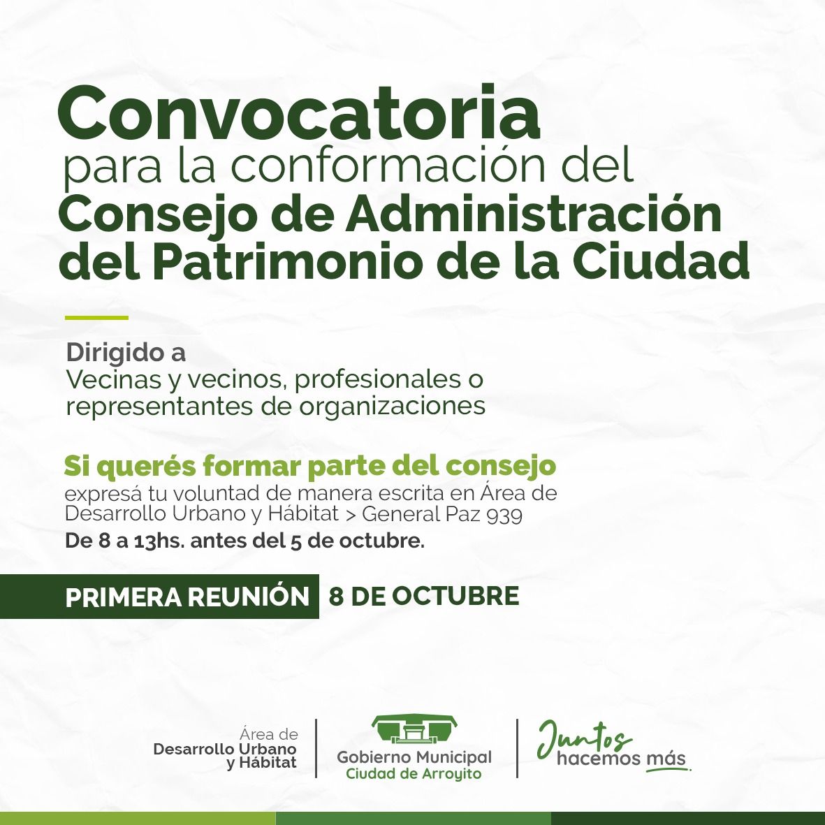 El Gobierno Municipal en el marco de la Ordenanza N°1832/2018 “Protección del Patrimonio Arquitectónico y Urbanístico y de Áreas de valor Histórico-Cultural”, convoca a la población a conformar este Consejo que se reunirá por primera vez el día 8 de Octubre, el Día Nacional del Patrimonio Natural y Cultural Argentino.