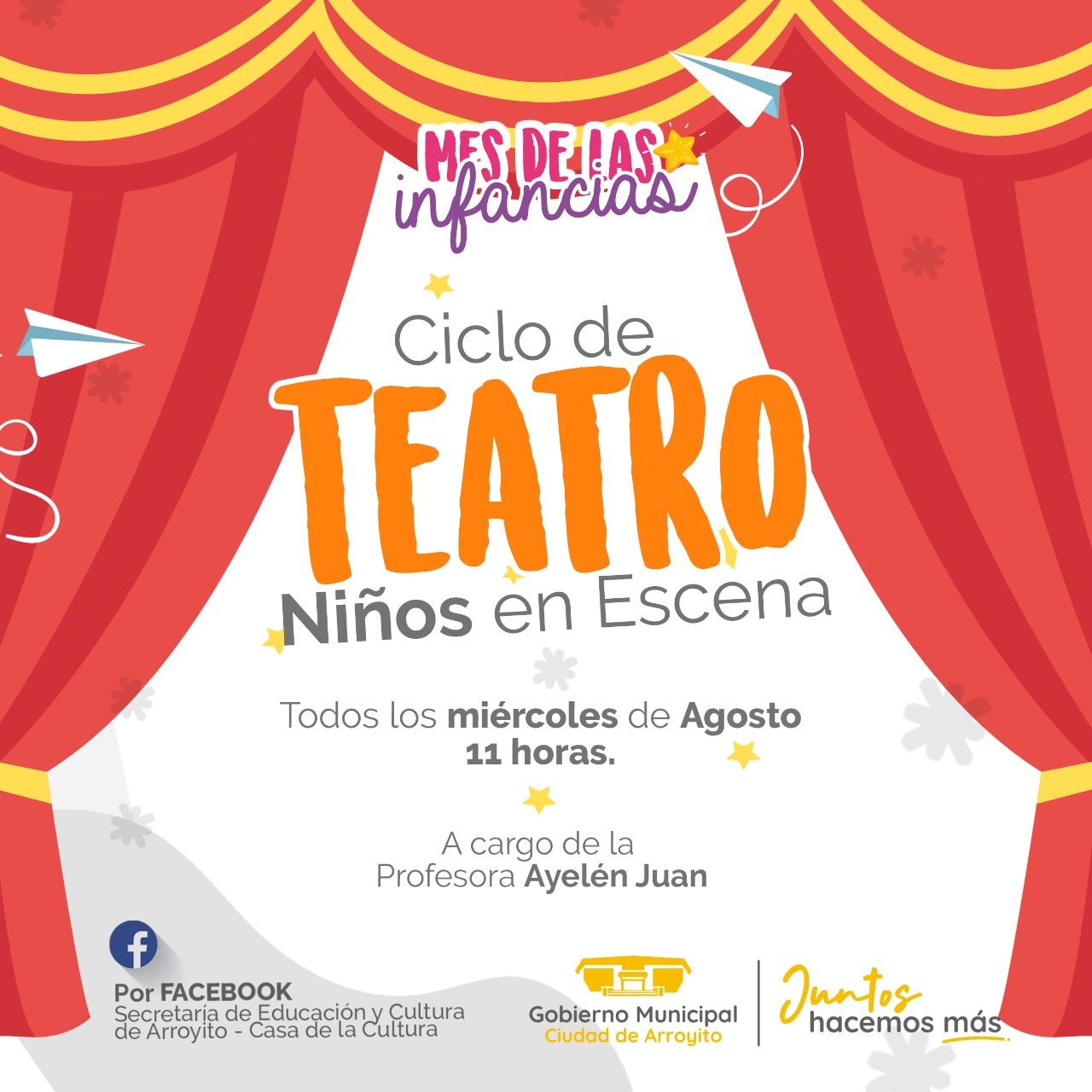 En el marco del Mes de las Infancias, el Programa Arroyito Ciudad de Niños y Niñas, y todas las áreas municipales del Gobierno, invitan a la población a participar del Ciclo de Teatro Niños en Escena, que realizará en vivo la Prof. Ayelén Juan y será trasmitido todos los días miércoles de agosto por las redes sociales del Municipio y de la Secretaría de Educación y Cultura.