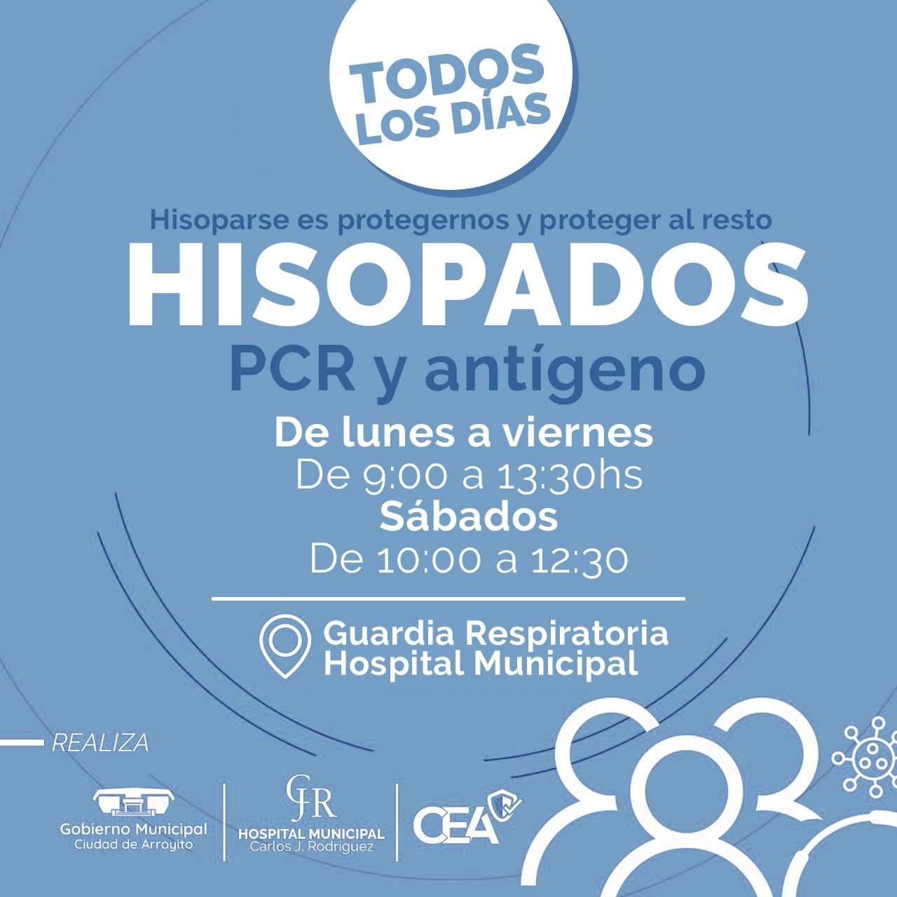 El Gobierno Municipal de la Ciudad de Arroyito a través del CEA informa que a partir de este 9 de diciembre, se realizarán hisopados todos los dias en la Guardia Respiratoria del Hospital Municipal en los siguientes horarios: