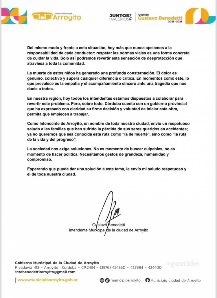 Conmovido por la tragedia vial que dejó cuatro muertos en la Ruta Nacional 19, el intendente de Arroyito, Gustavo Benedetti, publicó una carta abierta dirigida al presidente Javier Milei.