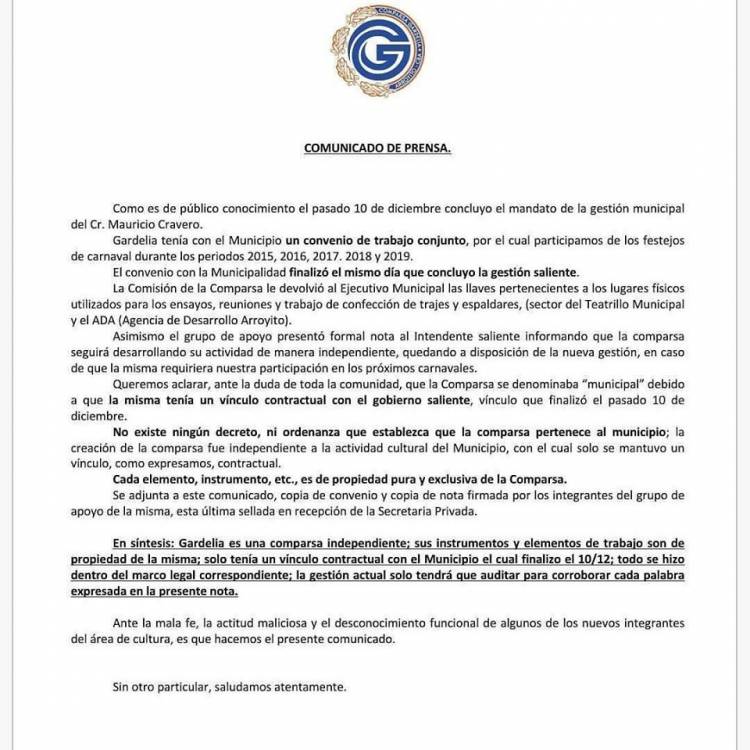 La Municipalidad de Arroyito inicia acciones legales contra la Comparsa Gardelia.