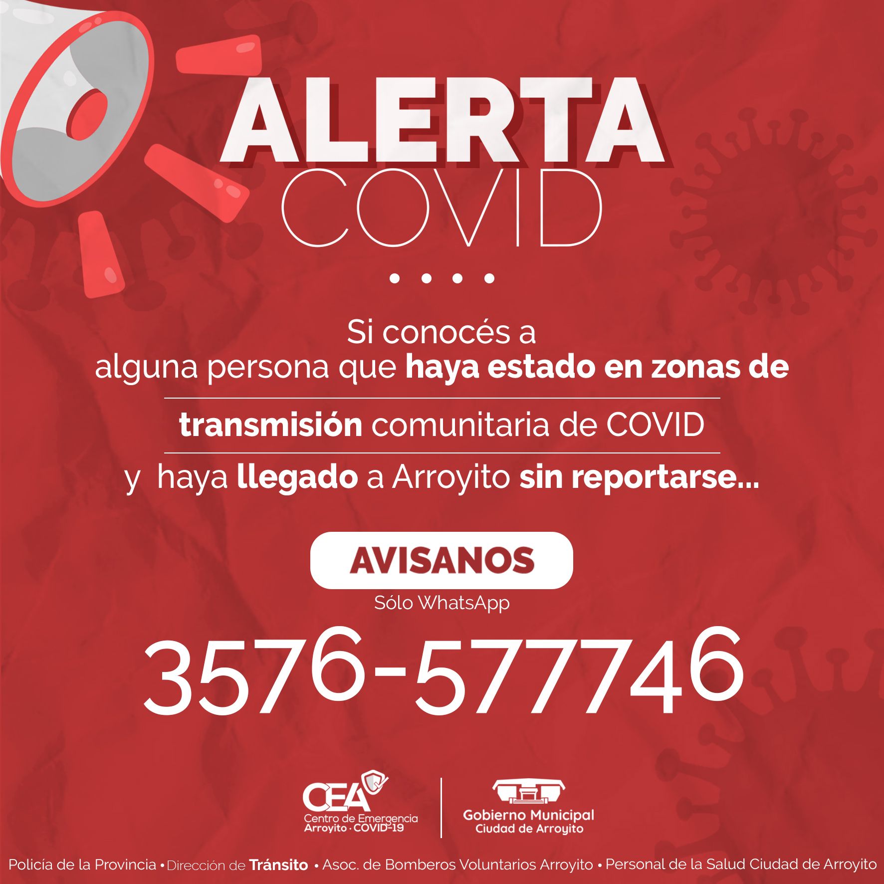 Recordamos a la población que en caso de conocer que alguna persona haya llegado a Arroyito proveniente de zonas de circulación comunitaria del virus y sin reportarse con las autoridades sanitarias, pueden dar AVISO al número de teléfono ALERTA COVID, 3576 -577746.