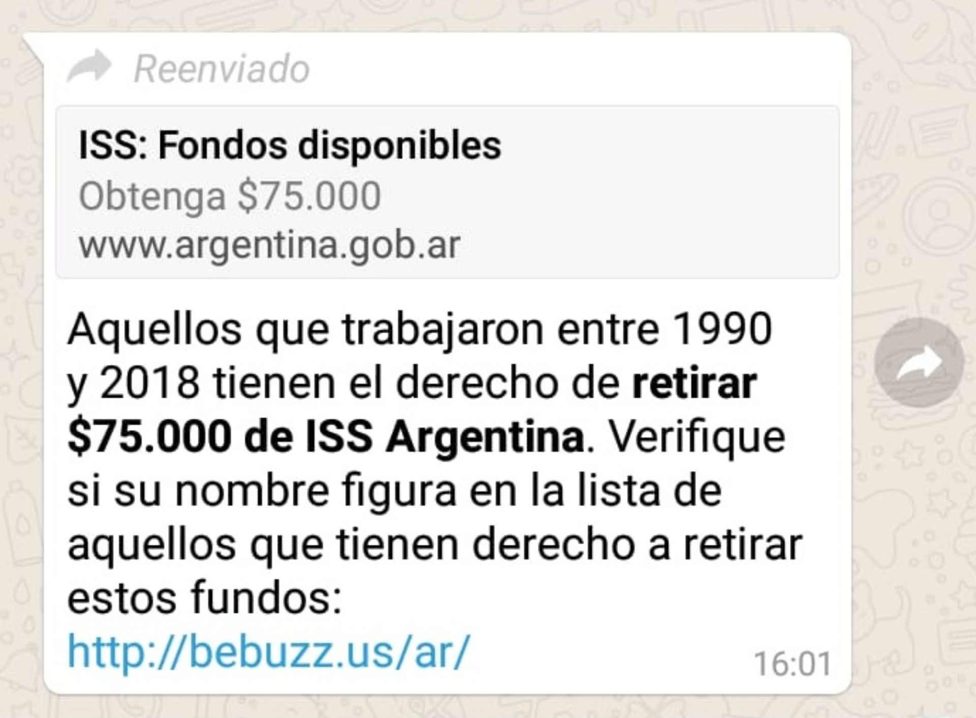 Durante estos días se ha hecho viral un mensaje de Whatsapp que ofrece $75 mil a trabajadores argentinos que hayan cumplido funciones desde 1990 a 2018.