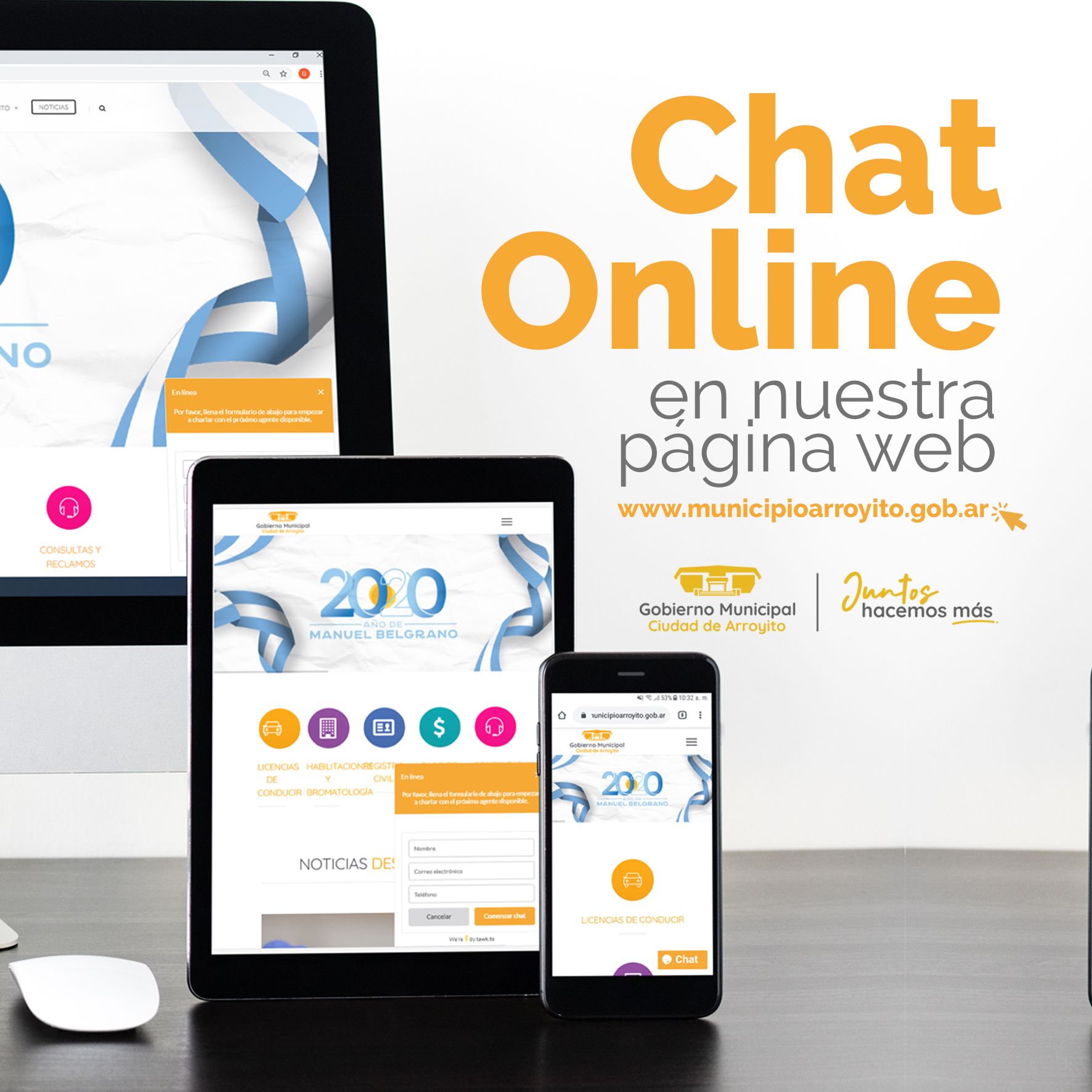 Con el objetivo de seguir mejorando los canales de comunicación con nuestros vecinos, desde el Gobierno Municipal hemos incorporado en nuestra Página Web, un Chat Online.