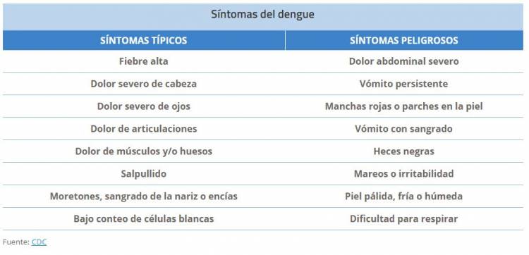 A diferencia de otras enfermedades, el dengue tiene diferentes síntomas dependiendo de la etapa en la que se encuentre. Según el Centro para el Control y Prevención de Enfermedades, los síntomas más comunes son: