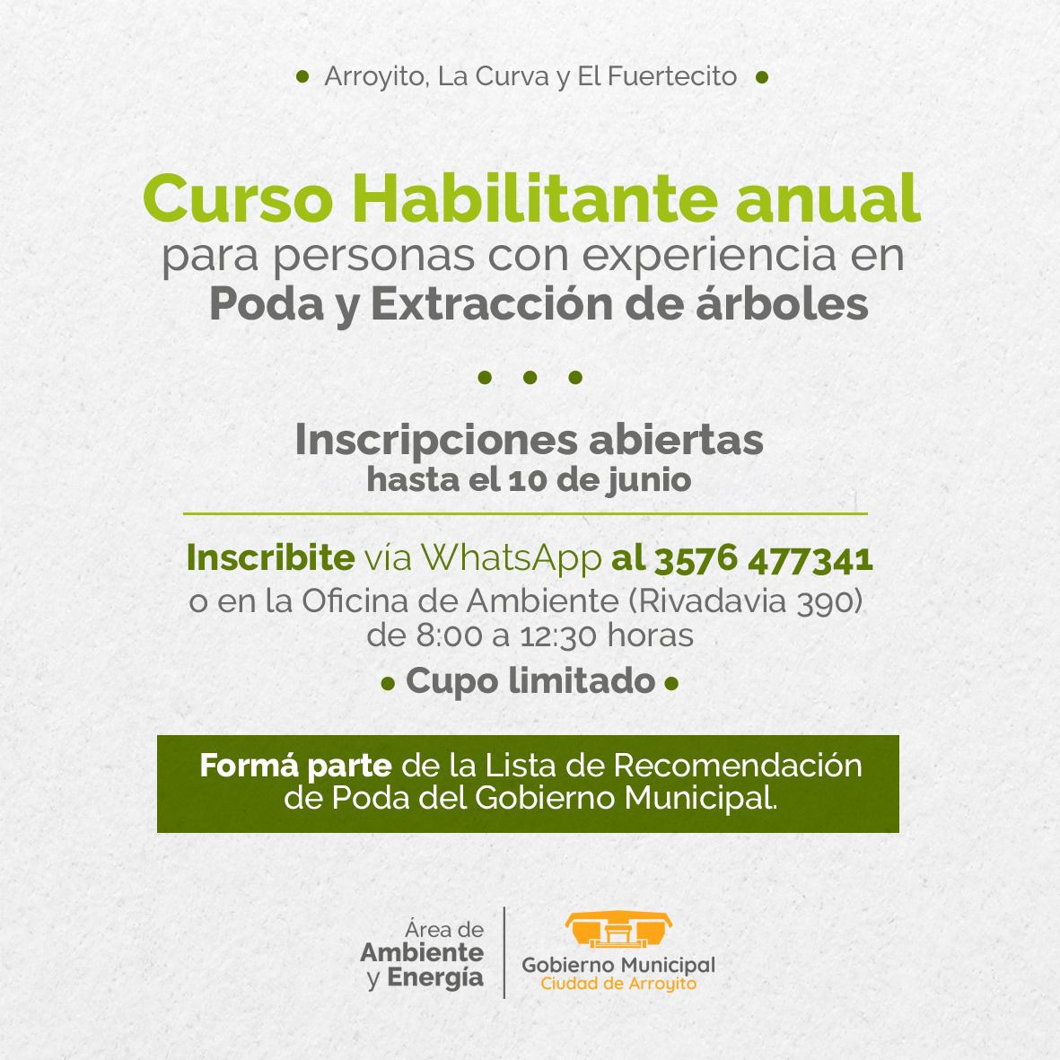El gobierno municipal, a través del Área de Ambiente y Energía, invita a todos los vecinos y vecinas que actualmente estén desarrollando actividades laborales de poda y/o extracción de árboles o que quieran desempeñarse en el rubro, a anotarse en dicha oficina, ubicada en Rivadavia 390 o al 3576-477341 (presentarse con copia del DNI), al curso Habilitante de Poda y/o Extracción de Árboles Urbanos, de manera gratuita.