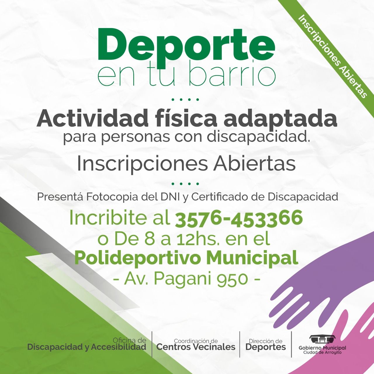 En el marco del Programa Municipal Deporte en tu Barrio, tarea que se desarrolla a través de la articulación con distintos Centros Vecinales, lanzamos las inscripciones para Actividad Física Adaptada para personas con Discapacidad.