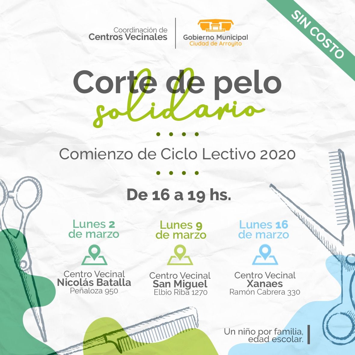 La Coordinación de Centros Vecinales del Gobierno Municipal invita a todos los niños y niñas en edad escolar, de Arroyito, La Curva y El Fuertecito, a realizarse Cortes de Pelo gratuitos, en el marco del comienzo de clases.