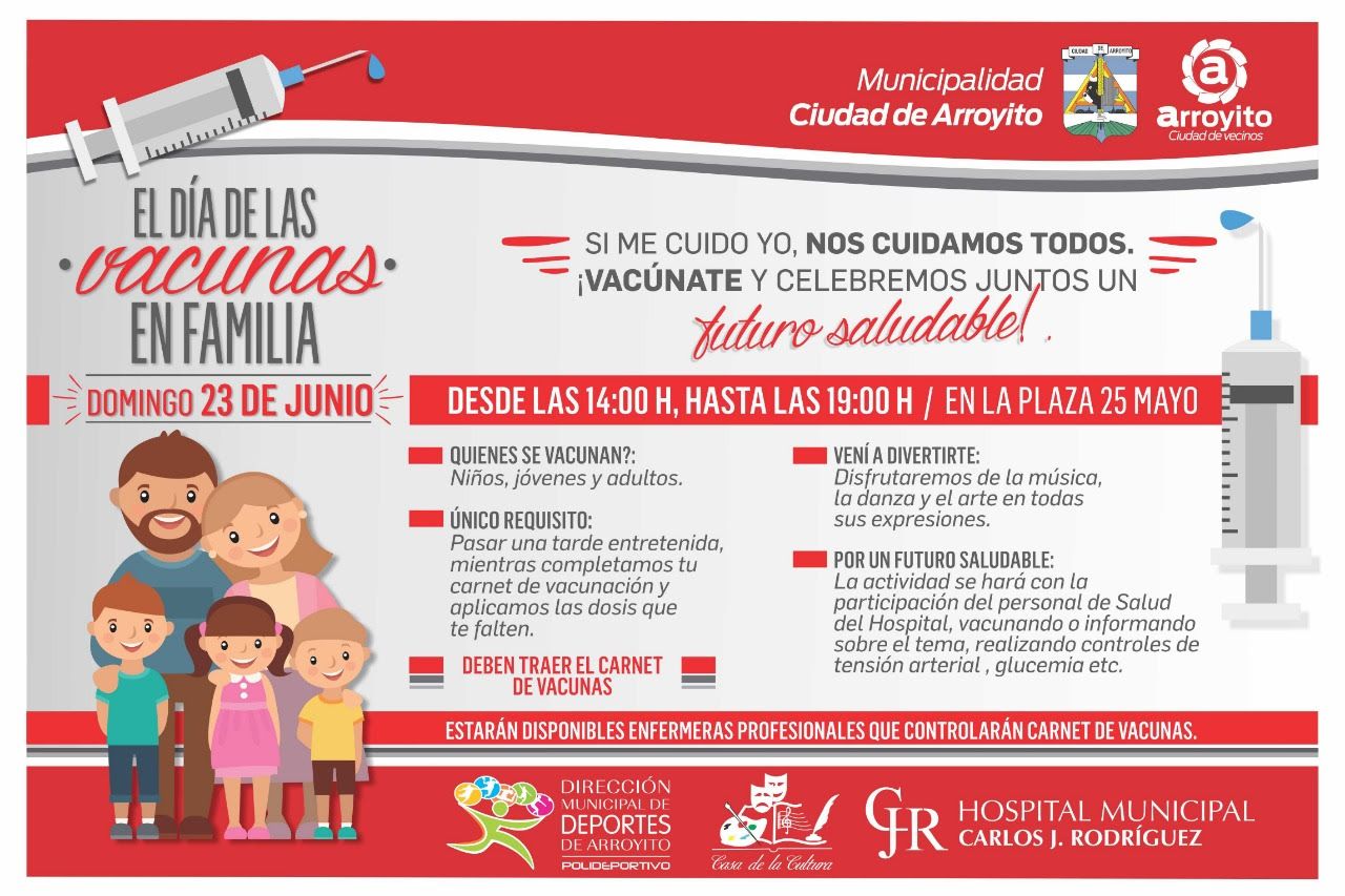 La Municipalidad de la ciudad de Arroyito, a través del Hospital Municipal y la Dirección de Cultura, informa que el próximo domingo 23 de junio a partir de las 14,00hs. en la Plaza 25 de mayo, se realizará “El Día de la Vacunas en Familia”, segundo año consecutivo que se realiza este evento, cuyo slogan es “SI ME CIUDO YO, NOS CIUDAMOS TODOS ¡VACUNATE Y CELEBREMOS JUNTOS UN FUTURO SALUDABLE”. Habrá encargados de la salud dispersos en la plaza haciendo el control de las vacunas que necesitamos tener y en Casa de la Cultura se realizarán las aplicaciones de las mismas.