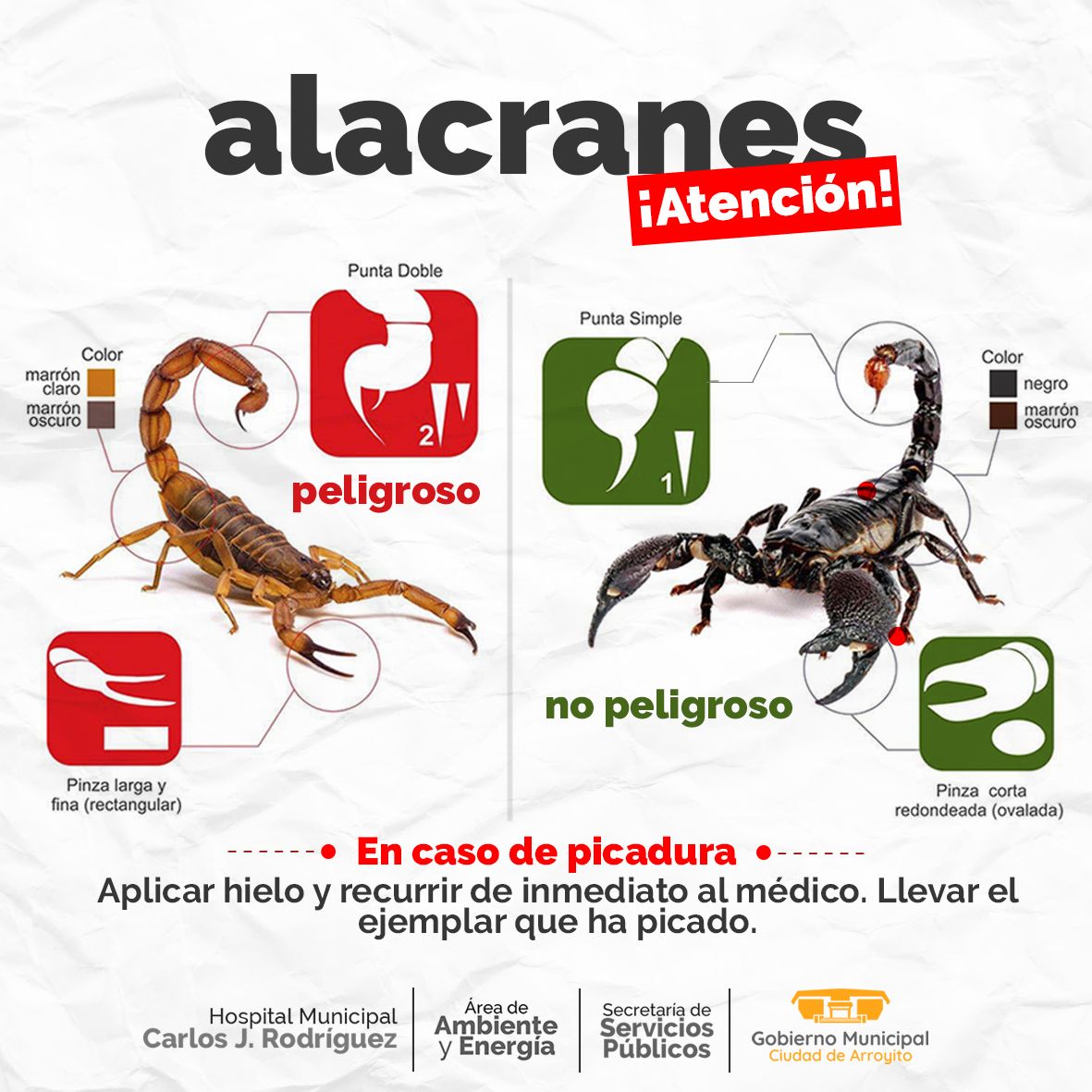 El Gobierno Municipal, a través del Área de Ambiente y Energía, el Hospital Municipal Carlos J. Rodríguez y la Secretaría de Servicios Públicos comunica las siguientes medidas de prevención para evitar picaduras de alacranes: