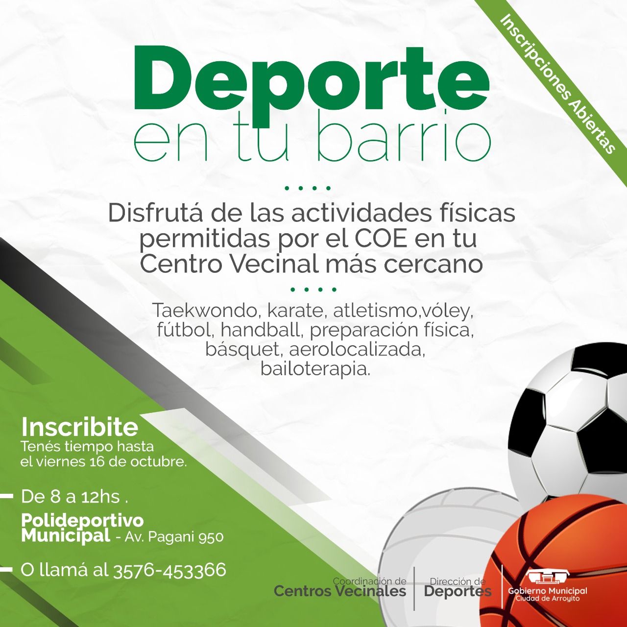 Taekwondo, karate, atletismo, vóley, futbol, hándbol, preparación física, básquet, aero-localizada, bailo terapia, serán algunas de las propuestas que se brindarán tomando las máximas medidas de bioseguridad. Para ello, los profesores del polideportivo Municipal trabajarán en los Centros Vecinales de Arroyito, La Curva y en El Fuertecito.