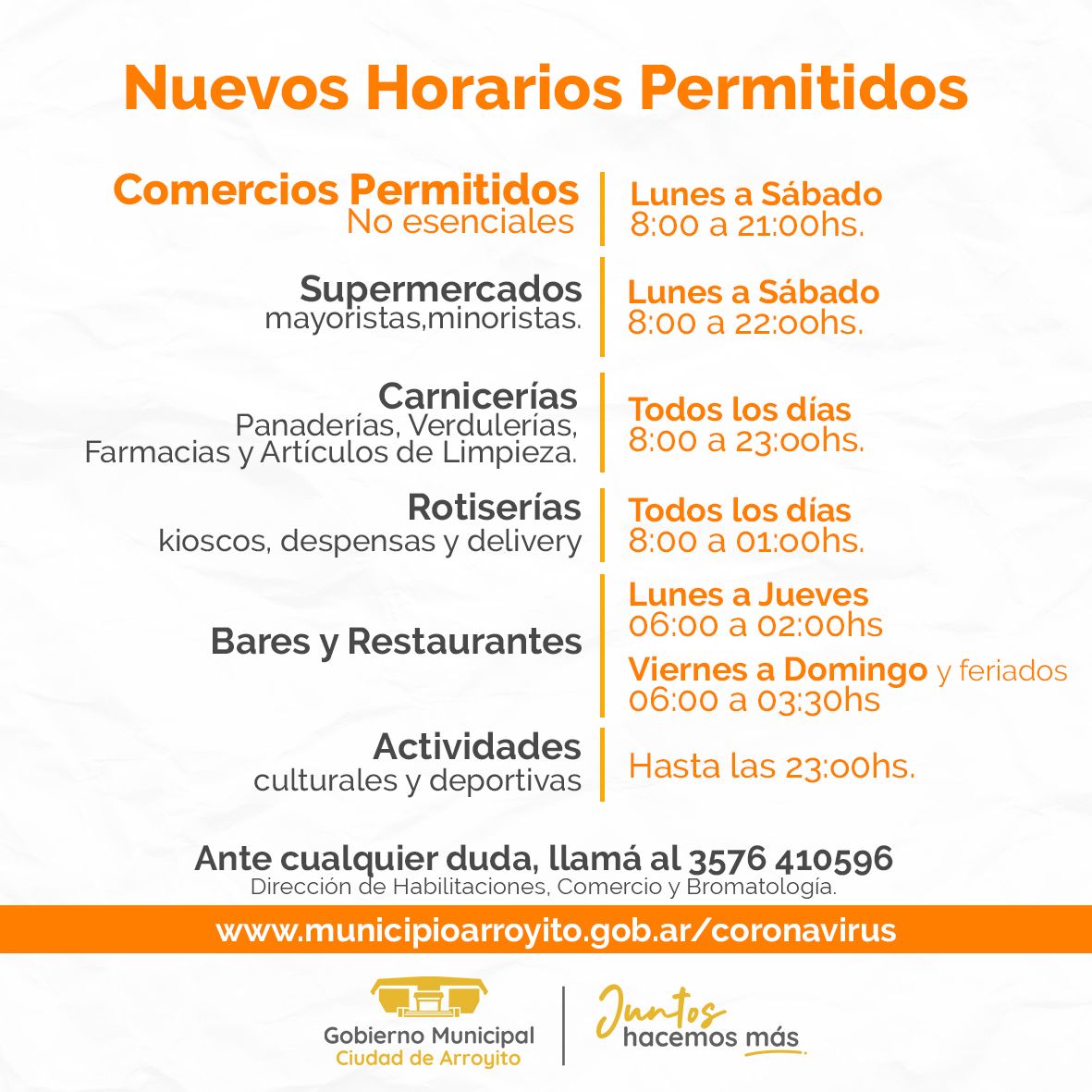 El Centro de Emergencia de Arroyito en conjunto con la Dirección de Habilitaciones, Comercio y Bromatología del Gobierno Municipal, ha dispuesto nuevos horarios de atención al público para comercios permitidos de la localidad. Los mismos comenzarán a regir desde el día miércoles 19 de agosto.