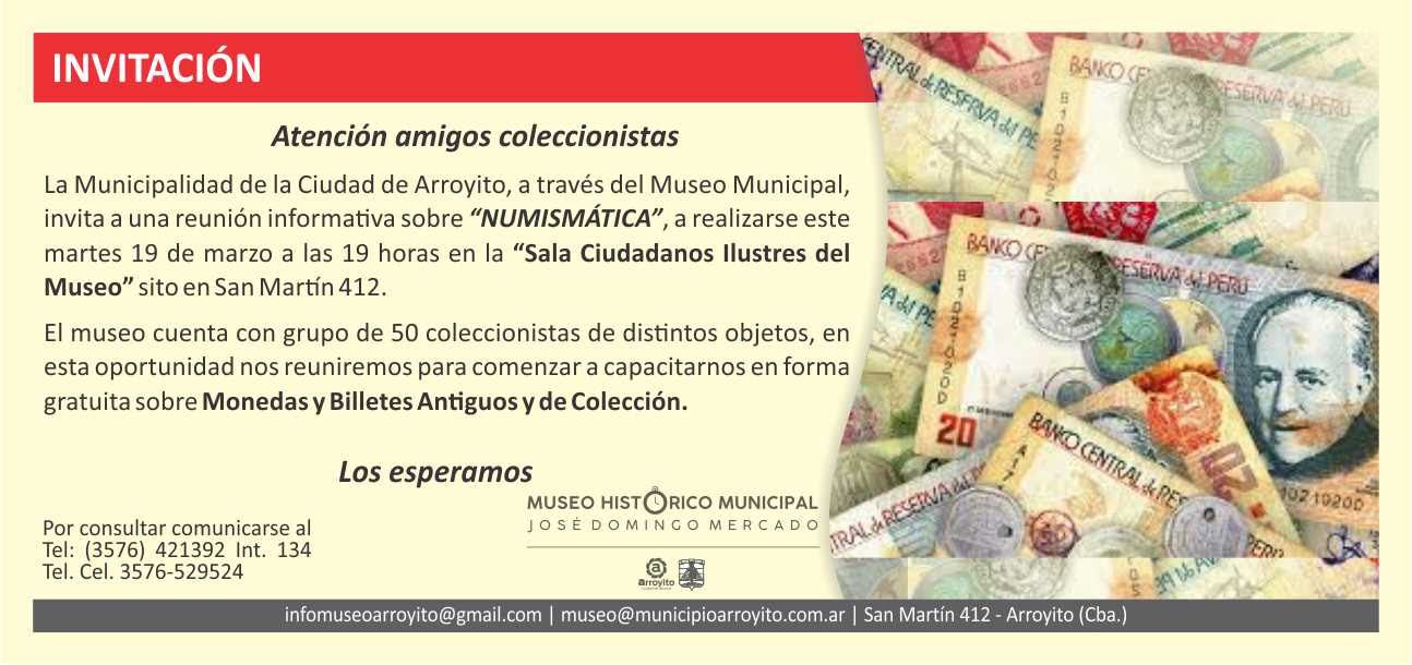 La Municipalidad de la ciudad de Arroyito, a través del Museo Municipal, invita a una reunión informativa sobre “NUMISMÁTICA”, a realizarse este martes 19 de marzo a las 19 horas en la “Sala Ciudadanos Ilustres del Museo” sito en San Martín 412.