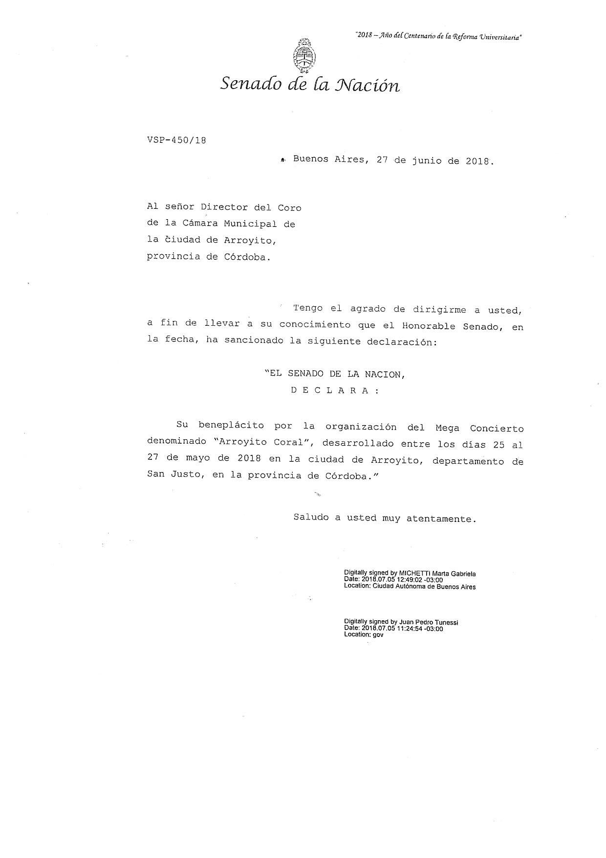 La Municipalidad de la ciudad de Arroyito, informa que días pasados el ejecutivo municipal recibió una Declaración del Senado de la Nación firmado por la Vice-Presidente de la Nación Gabriela Michetti. Dicho documento declara el beneplácito del Senado de la Nación respecto a la organización del 1er. Mega Concierto “Arroyito Coral”, que contó con la visita de los Coros “Sagrada Familia” de Banfield, y “Modelo” de Lomas de Zamora, ambos de la provincia de Buenos Aires, además de las actuaciones del los Coros Infanto Juvenil y de Cámara Municipal, dirigidos por el Profesor Joel Coronel, mentor de este gran evento cultural.