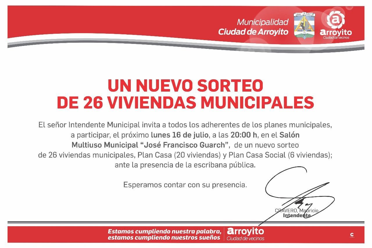La Municipalidad de la ciudad de Arroyito a través del Intendente Mauricio Cravero invita a todos los adherentes de los planes municipales, a participar, hoy lunes 16 a las 20 horas, en el Salón Multiuso Municipal “José Francisco Guarch”; de un nuevo sorteo de 26 Viviendas Municipales, Plan Casa (20 Viviendas), y Plan Cacas Social (6 Viviendas) ante la presencia de la escribana pública.