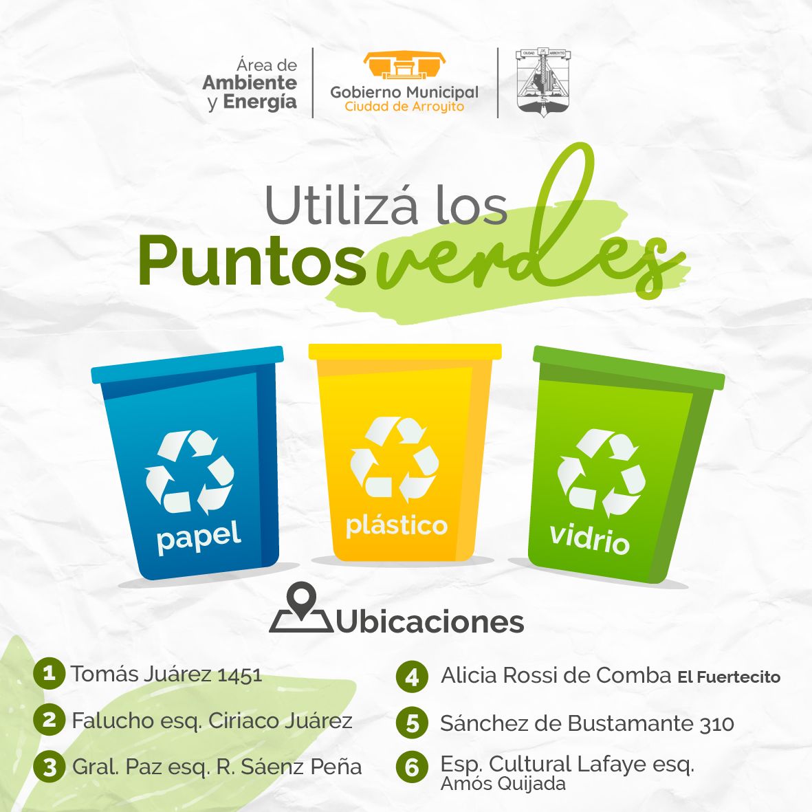 El Gobierno Municipal de Arroyito, a través del Área de Ambiente y Energía, a cargo de la Dra. Ing. Lelia Imhof, recomienda a la población de Arroyito, la separación adecuada de los residuos y la utilización de los Puntos Verdes de la Ciudad.